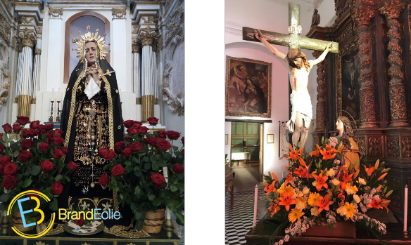 La statua dell’Addolorata e quella della Maddalena sotto la croce di Gesù addobbate per la processione del Venerdì Santo dalle Consorelle della Pia Unione.