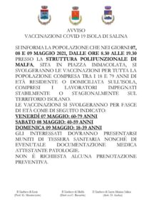 Dal 7 al 9 maggio vaccinazione diffusa nell’isola di Salina. I sindaci di Malfa, Santa Marina e Leni, in una nota congiunta hanno comunicato alla popolazione che nei giorni 7-8 e 9 maggio , dalle 8,30 alle 19,30, presso la...