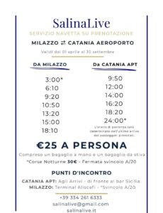 Orari  dal 1 aprile 2026  al 30 Settembre 2026 -Transfert  Aeroporto Catania –  Milazzo – Milazzo – Aeroporto Catania